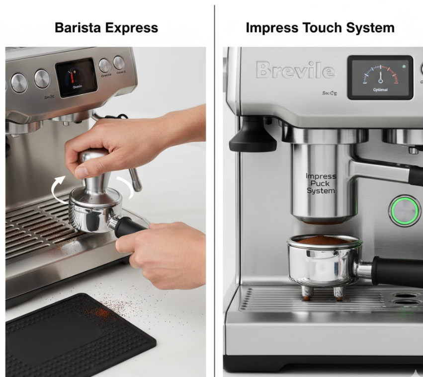 - The Tech: It features a beautiful, swipe-and-select touchscreen. But the real star is the Impress™ Puck System. It automatically calculates the perfect dose of coffee and assists you with a mechanized tamping lever that delivers a precise 22lbs of pressure (finished with a 7-degree barista twist) for a flawless, polished puck every time.